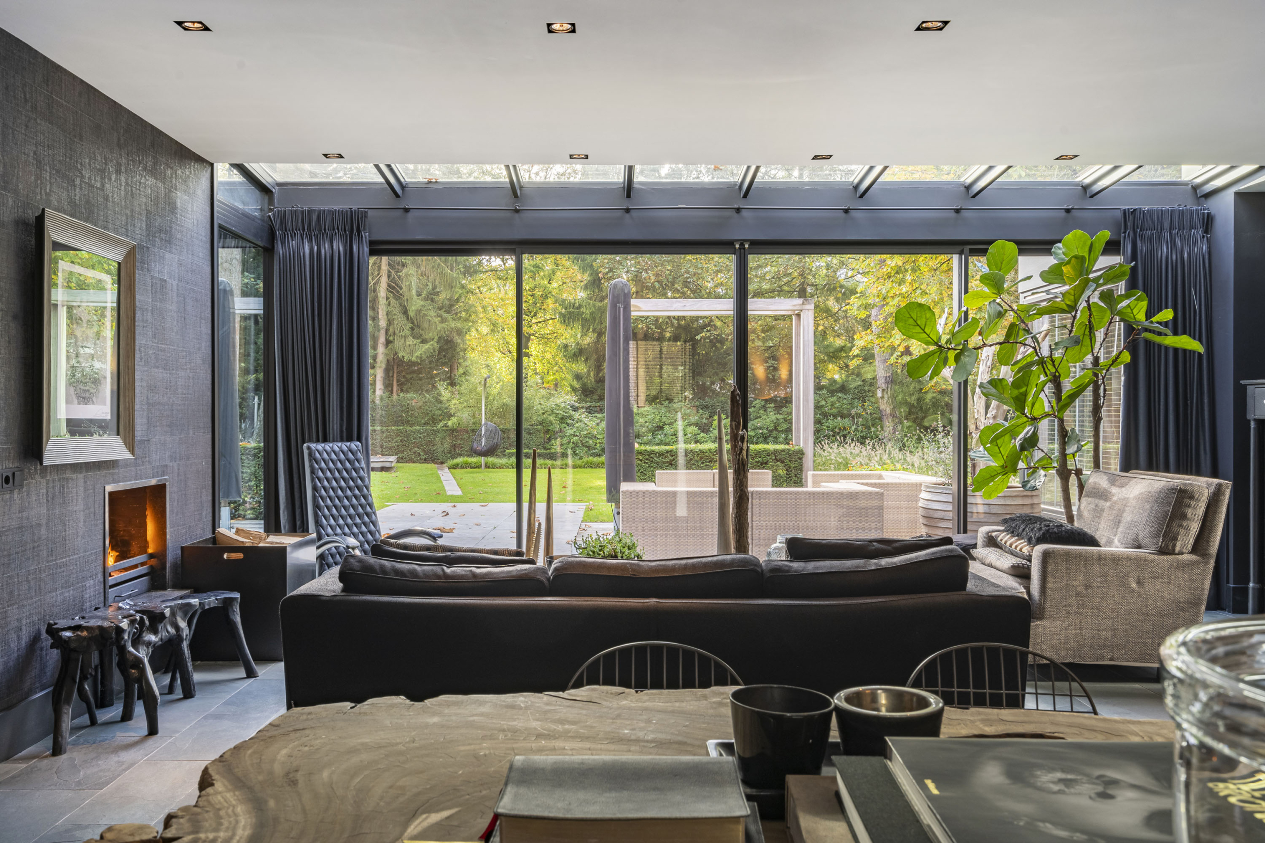 Vanuit de entree met gastentoilet en ruime garderobekasten word je verwelkomd door stalen openslaande deuren die leiden naar het belangrijkste vertrek van de villa: de centrale woonkamer van maar liefst 95 m2. Vanuit deze ruimte kun je aan alle kanten naar buiten kijken. Aan de tuinzijde biedt de zes meter brede aluminium schuifpui toegang tot een 100 m2 groot en zonnig terras, waar je op de eerste rang zit om het uitzicht op de tuin te beleven. Centraal in de woonkamer vormen twee ‘back to back’ open haarden, een echte eye catcher.