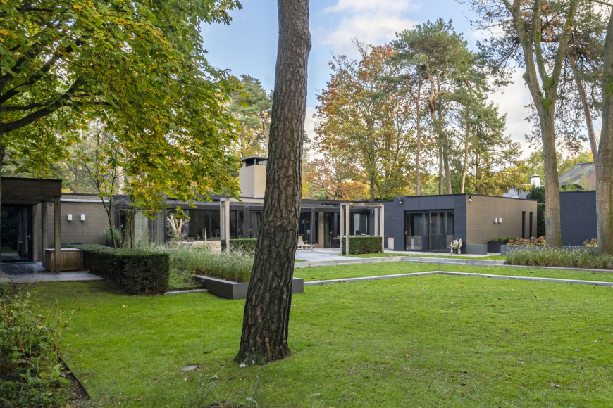Het bijzondere aan deze villa is dat het huis de achtertuin als het ware ‘omarmt’. De geheel gelijkvloerse villa is als een vlinder: met in het midden de woonkamer als warm kloppend hart van waaruit zich de twee vleugels uitstrekken. Een linkervleugel met keuken en de slaapvertrekken en een rechtervleugel met de ontspanningsruimten en garage. Met daartussen de tuin met zijn volwassen bomen. Zoals de eigenaar zelf zegt: “Je hebt geen huis in het bos, je hebt een bos in je huis!”