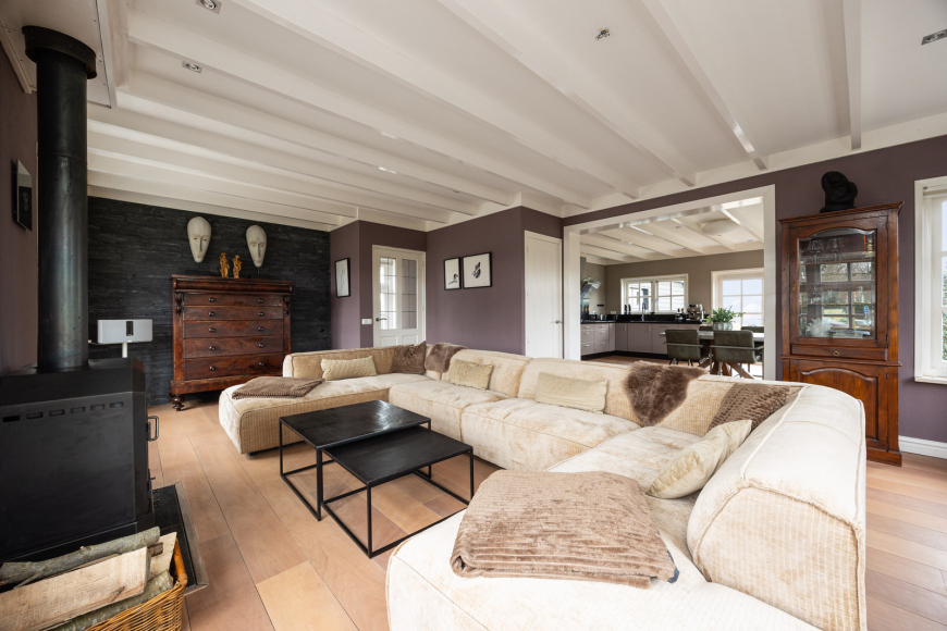 Aansluitend aan de woonkeuken bevindt zich de woonkamer, gelegen aan de voorzijde van de woning. Daar waar de grote raampartijen zorgen voor een lichte en ruimtelijke sfeer vormt de robuuste houtkachel de warme sfeermaker van de ruimte. Vanuit de zithoek kijkt u uit over de voortuin en heeft u uitzicht op het kanaal. Net als in de keuken is er een fraaie houten vloer, die in 2024 is geschuurd en behandeld.