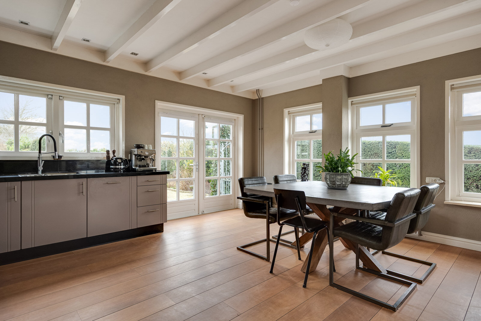 Vanuit de keuken is er zicht op de orangerie, een mooie multifunctionele ruimte op tuinniveau. Het witgeschilderde metselwerk met halfronde ramen en de robuuste zwarte stalen spanten zorgen voor een fraaie uitstraling vol sfeer en karakter.
